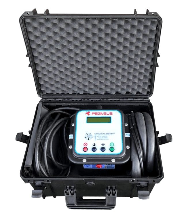 The Calder Pegasus HC Electrofusion Welder for PE pipes capable of welding up to 1000mm diameter pipes. Features barcode scanning and manual time entry.
